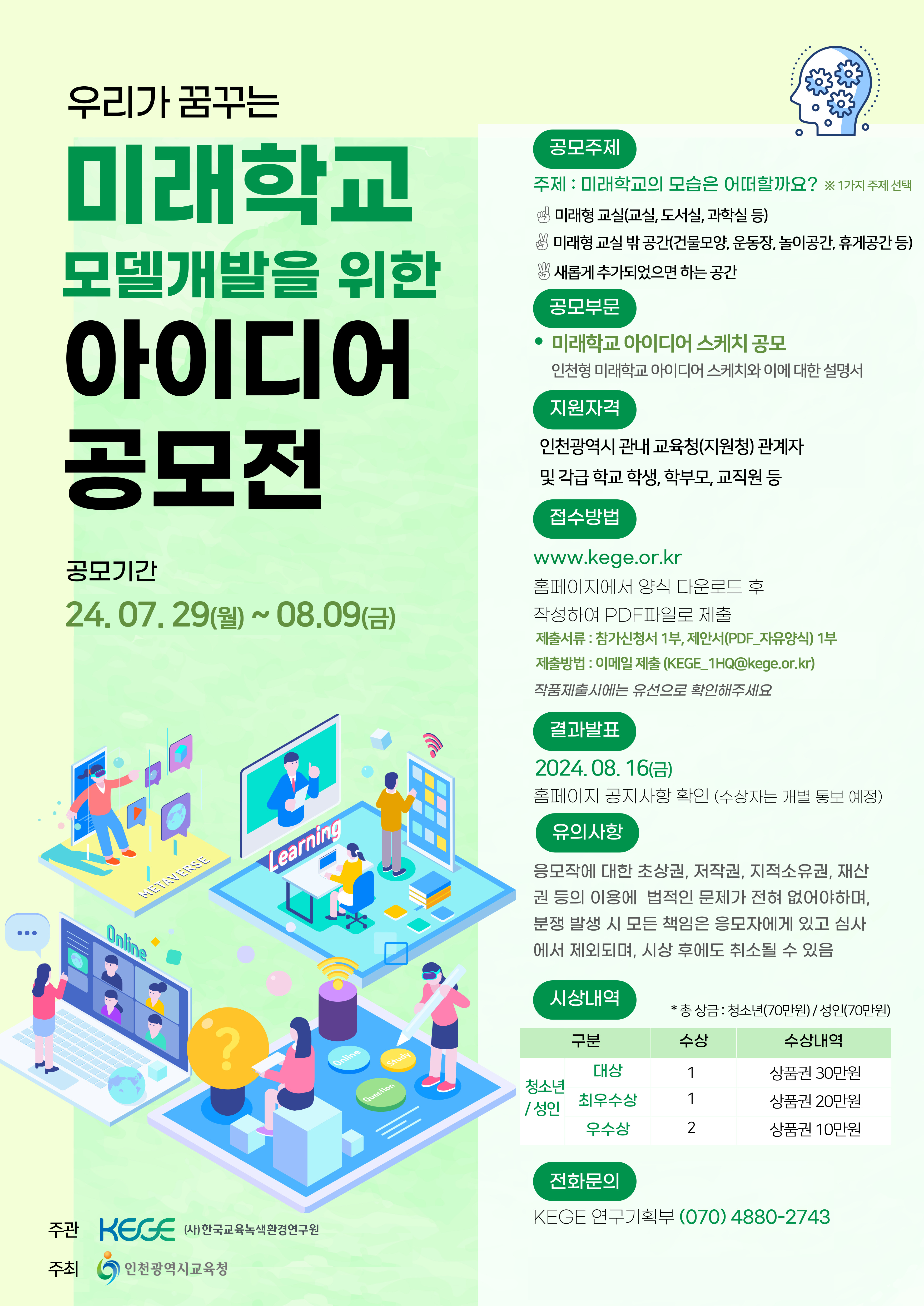 °¡. °ø¸ð ÁÖÁ¦ : ¿ì¸®°¡ ²Þ²Ù´Â ¹Ì·¡Çб³ ¸ðµ¨°³¹ßÀ» À§ÇÑ ¾ÆÀ̵ð¾î ½ºÄÉÄ¡ °ø¸ð ³ª. ¼¼ºÎ ³»¿ë : ÇлýµéÀÌ Èñ¸ÁÇÏ´Â °ø°£ÀÇ ¸ð½À¿¡ ´ëÇÑ ÀÚÀ¯·Î¿î ¾ÆÀ̵ð¾î Á¦½Ã [ÁÖÁ¦ 1] ¹Ì·¡Çü ±³½Ç(±³½Ç, µµ¼½Ç, °úÇÐ½Ç µî) [ÁÖÁ¦ 2] ¹Ì·¡Çü ±³½Ç ¹Û °ø°£(°Ç¹°¸ð¾ç, ¿îµ¿Àå, ³îÀ̰ø°£, ÈÞ°Ô°ø°£ µî) [ÁÖÁ¦ 3] »õ·Ó°Ô Ãß°¡µÇ¾úÀ¸¸é ÇÏ´Â °ø°£ *1°¡Áö ÁÖÁ¦ ¼±Åà ´Ù. ÁøÇà ÀϽà : 2024.07.29.(¿ù)~2024.08.09.(±Ý), 12Àϰ£ ¶ó. È«º¸ ´ë»ó : ÀÎõ±¤¿ª½Ã °ü³» ±³À°Ã»(Áö¿øÃ») °ü°èÀÚ ¹× °¢±Þ Çб³ Çлý, Çкθð, ±³Á÷¿ø µî ¸¶. ±â´ë È¿°ú : ÀÎõÇü ¹Ì·¡Çб³ °ø°£ ±¸¼ºÀ» À§ÇÑ ´Ù¾çÇϰí Âü½ÅÇÑ ¾ÆÀ̵ð¾î È®º¸ ±â´ë ¹Ù. »ó±Ý : ¼ºÀÎ/û¼Ò³â ±¸ºÐ ½Ã»ó (´ë»ó 1¸í / ÃÖ¿ì¼ö»ó 1¸í / ¿ì¼ö»ó 2¸í) »ç. °ü·Ã ¹®ÀÇ : (»ç)Çѱ¹±³À°³ì»öȯ°æ¿¬±¸¿ø ¿¬±¸±âȹºÎ (070-4880-2473) *¼¼ºÎ °ø¸ð Á¢¼ö¹æ¹ý ¹× ÀÏÁ¤Àº ºÙÀÓÀÚ·á Âü°í ¡Ø ºÙÀÓ : 1. °ø¸ðÀü Æ÷½ºÅÍ 1ºÎ. 2. °ø¸ðÀü Âü½Åû¼ 1ºÎ. 3. °ø¸ðÀü »ùÇÃ(¾È) 1ºÎ. ³¡.