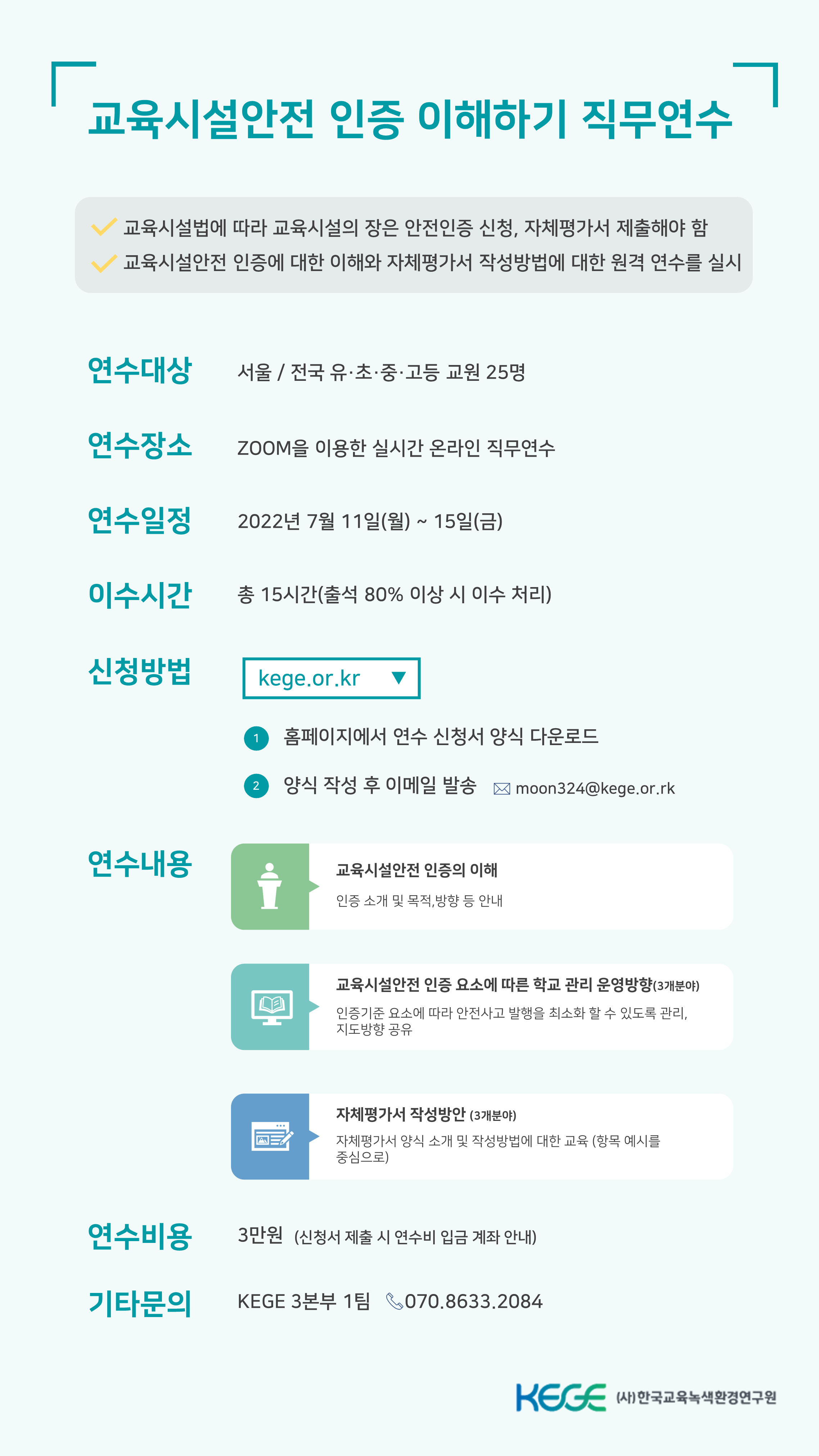 8. ¿¬¼ö ¸ñÀû: ¡¸±³À°½Ã¼³ µîÀÇ ¾ÈÀü ¹× À¯Áö°ü¸® µî¿¡ °üÇÑ ¹ý·ü¡¹¹ý Á¦11Á¶¿Í µ¿ ½ÃÇà·É Á¦14Á¶¿¡ µû¶ó ±³À°½Ã¼³ÀÇ ÀåÀº ¾ÈÀüÀÎÁõÀ» ½ÅûÇÏ¿©¾ß Çϸç, °°Àº ¹ý ½ÃÇà±ÔÄ¢ Á¦2Á¶¿¡ µû¶ó ±³À°½Ã¼³ÀÇ ÀåÀº ÀÎÁõ±âÁØ¿¡ µû¶ó ÀÚüÆò°¡¼­¸¦ Á¦ÃâÇØ¾ß ÇÔ¿¡ µû¶ó ±³À°½Ã¼³¾ÈÀü ÀÎÁõ¿¡ ´ëÇÑ ÀÌÇØ¿Í ÀÚüÆò°¡¼­ ÀÛ¼º¹æ¹ý¿¡ ´ëÇÑ ¿ø°Ý ¿¬¼ö¸¦ ½Ç½Ã